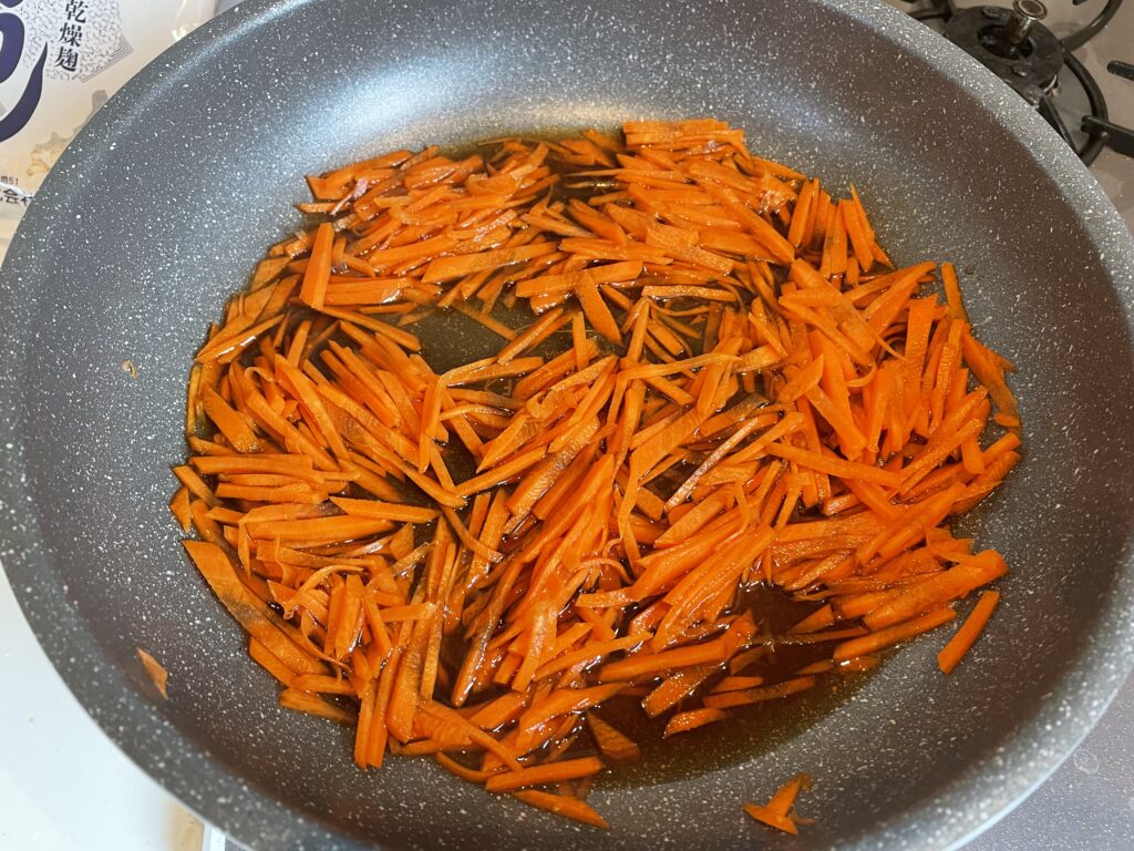鍋に追い鰹つゆを入れて一煮立ちさせ、千切りにしたにんじんを入れてさっと混ぜて火を消します