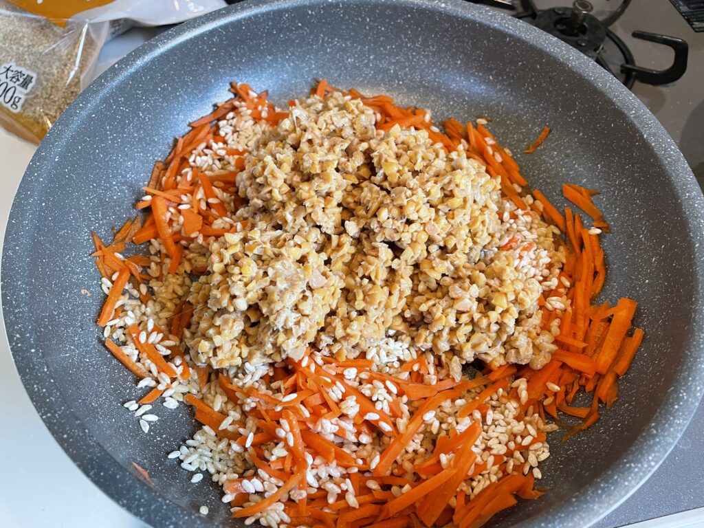 完全に冷めたらひきわり納豆を入れてよく混ぜます