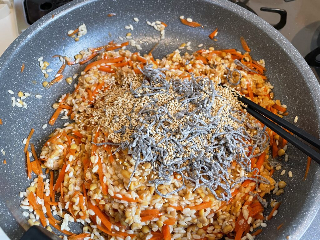 納豆が混ざったら、塩昆布と胡麻を入れてさらに混ぜます