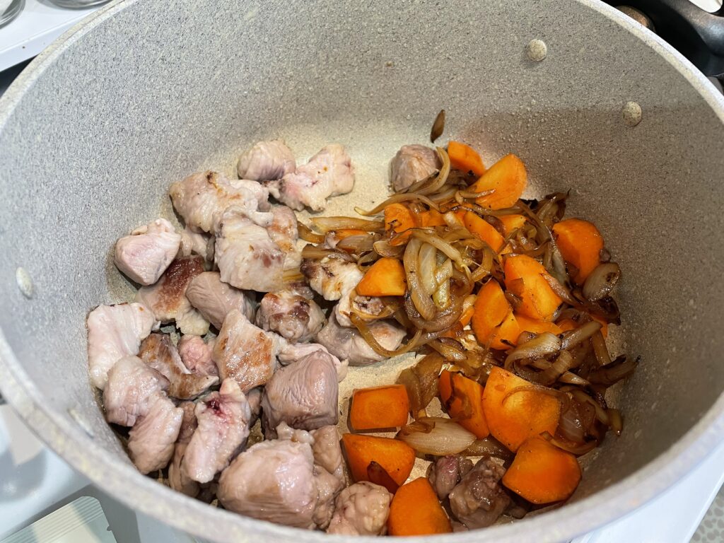 - またサラダ油をひいて玉ねぎをアメ色になるくらい炒めます途中でにんじんも入れて一緒に炒める